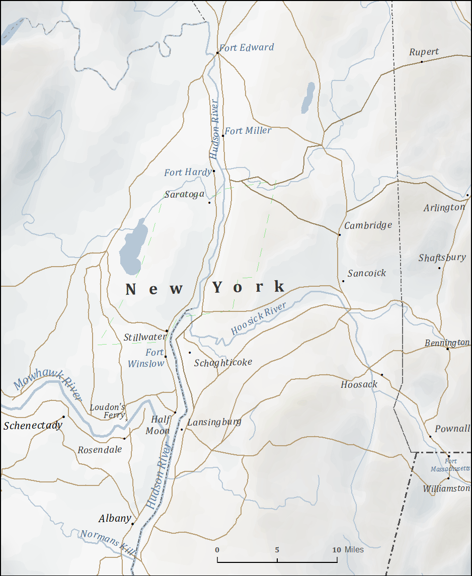 Territory where the American army traveled after evacuating Fort Ticonderoga.