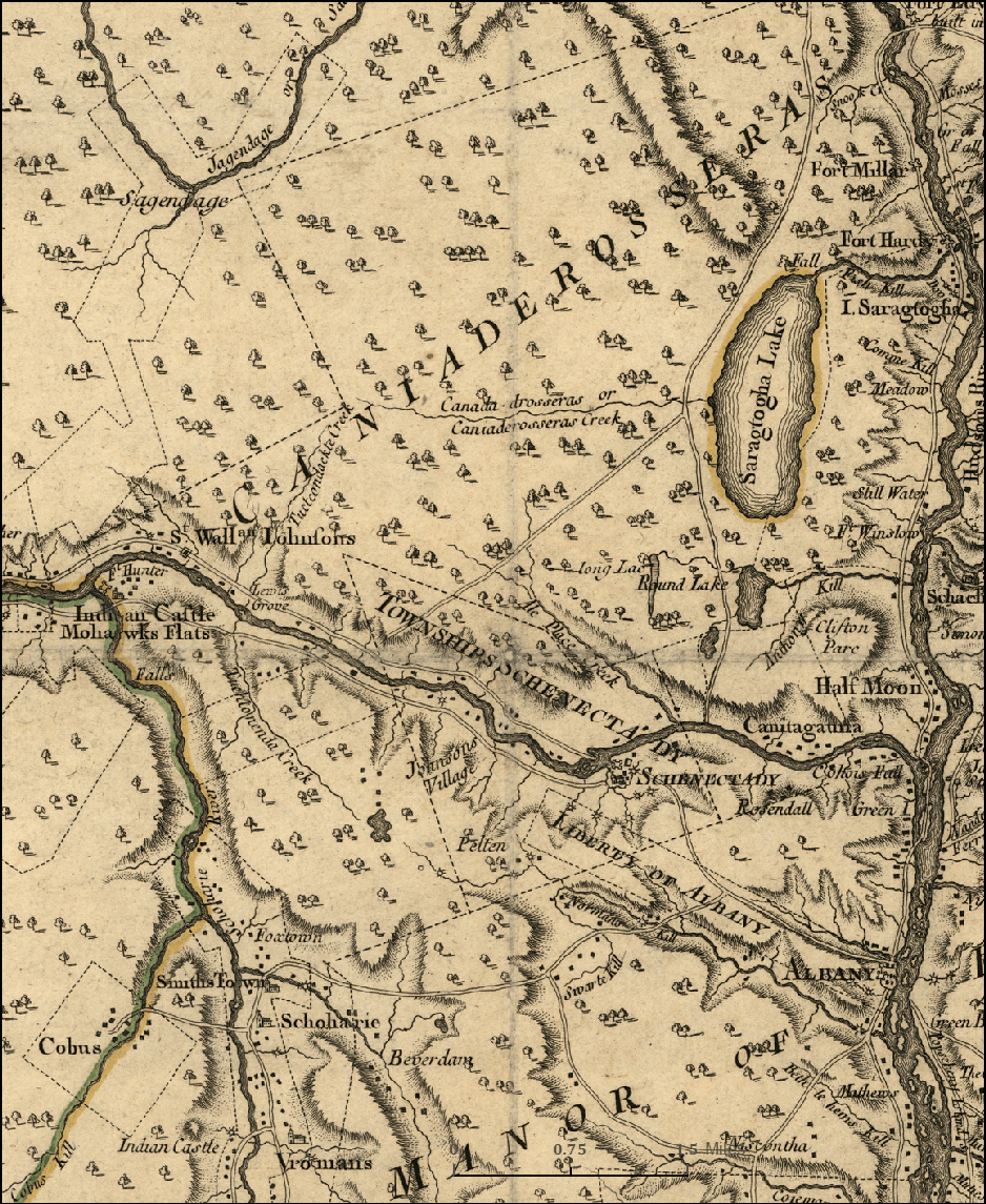 The area of Isaac’s 40-man scout. Source: Montrésor, J., Andrews, P. & Dury, A. 1777 “A map of the Province of New York, with part of Pensilvania[sic], and New England.” A. Drury, London